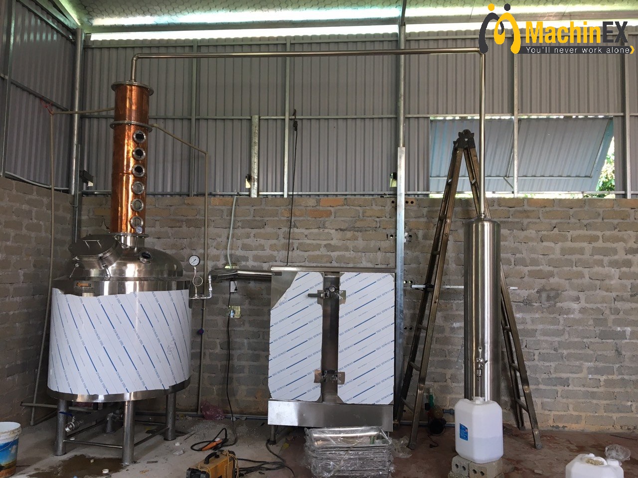 Thiết bị chưng cất dạng tháp mà anh tùng lựa chọn có công suất 100kg/mẻ cho nồi nấu và hệ thống đĩa luyện từ vật liệu đồng nguyên chất 100% được nhập khẩu và tủ hấp cơm 100kg/mẻ vật liệu Inox 304 tất cả thiết bị sử dụng nồi hơi điện để truyền nhiệt.