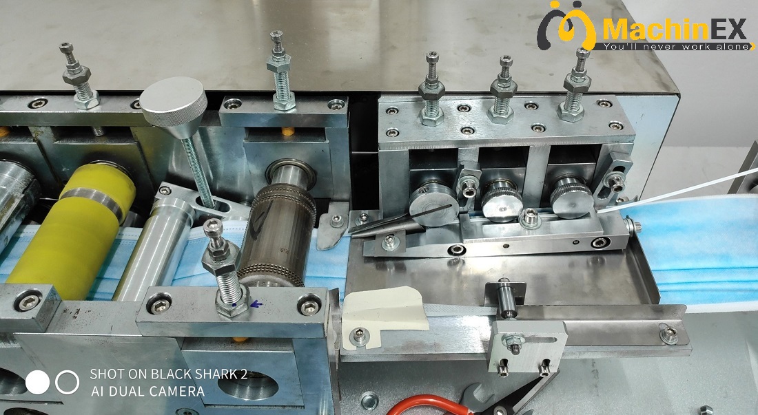 Các tấm khẩu trang được đưa theo hệ thống băng tải ra các máy hàn quai, bao viền. Chuẩn bị cho công đoạn hàn trên các máy hàn siêu âm vải không dệt. Tùy thuộc tốc độ và sản lượng yêu cầu, các tấm thân khẩu trang có thể được di chuyển thẳng tới một đầu hàn quai, bao viền hoặc được chia tự động ra 2, 3 băng tải tới 4, 6 đầu hàn siêu âm(mỗi bên 2 đầu hoặc 3 đầu) để đảm bảo năng suất.