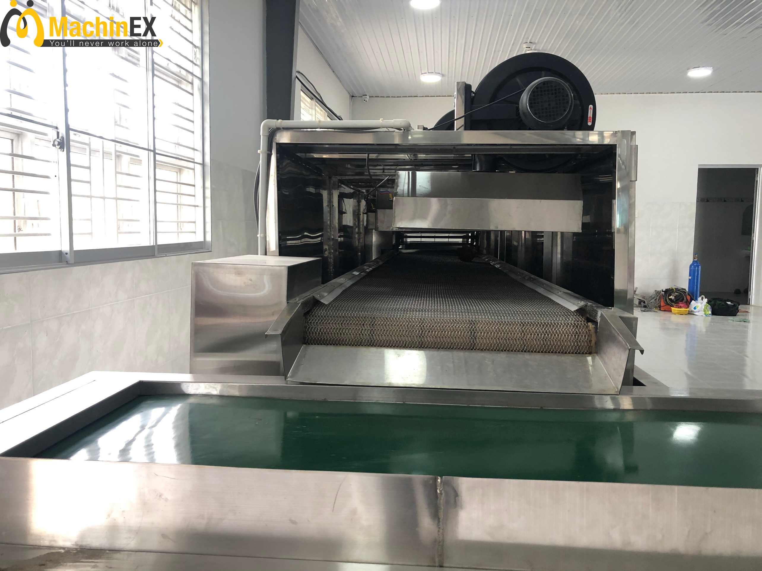 Băng chuyền thực phẩm sẽ đưa lượng rau củ quả đã được sục trong khoang chứa ra ngoài. Với thiết kế lỗ thoáng có răng cưa, thực phẩm đi qua băng chuyền gần như được ráo nước và không bị rơi rớt lại bể nước.