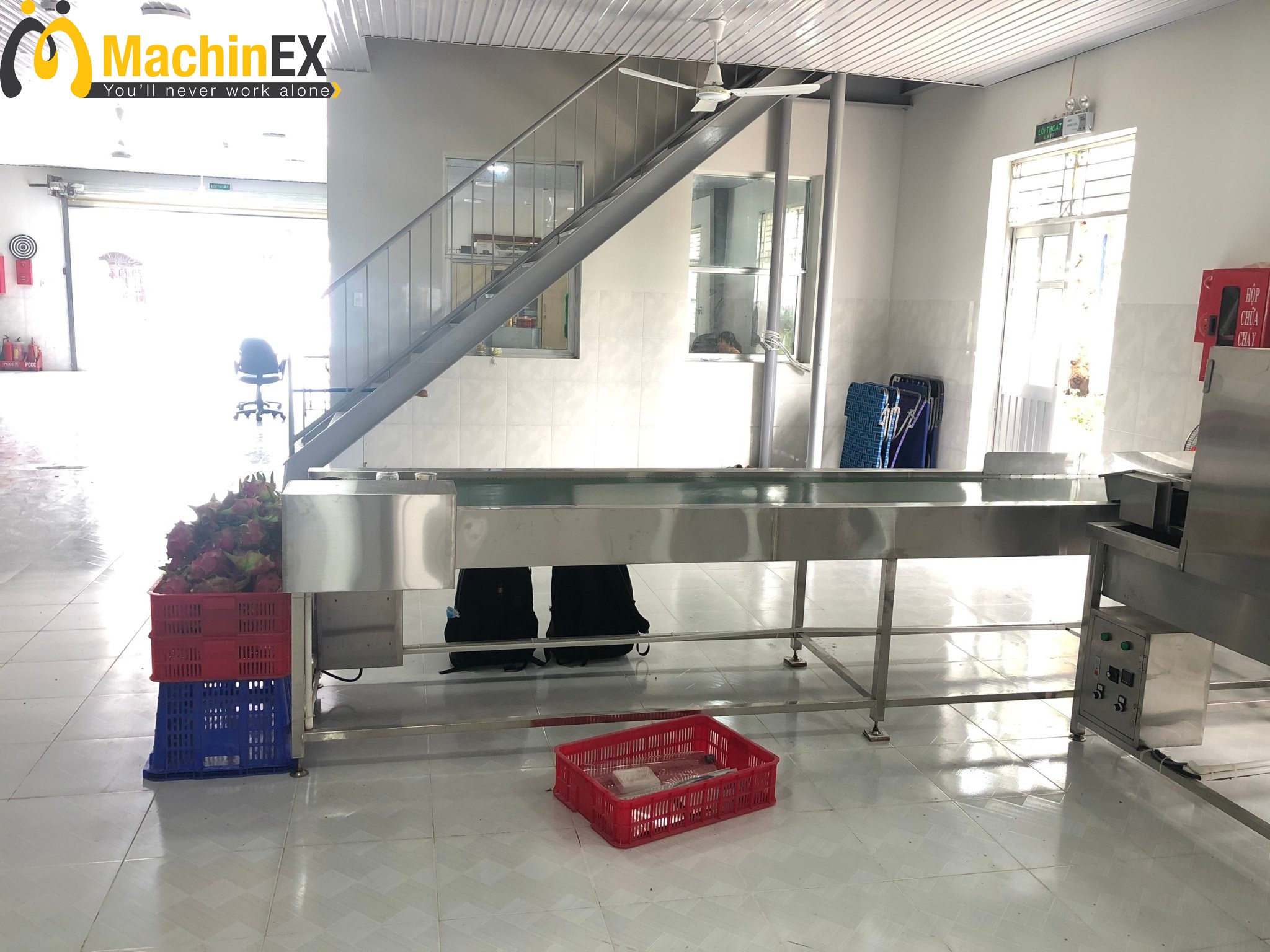 1.Máy Rửa Công Suất: 1500kg-2000kg/h - động cơ giảm tốc: 1.5kw/3phase - Bơm cao áp 25 HP - Bơm đẩy trái 10 HP - Quạt làm ráo: 2.2kw/380v/3phase - Vận tốc: 0÷0.1m/s có thể điều chỉnh bằng biến tần, tùy thuộc vào mức độ bẩn của thanh long - Lượng nước tiêu thụ: 3500 lít/1 ca làm việc - Kích thước LxWxH: 12.000 x 1200 x 1800 mm - Khung máy: mika trong suốt dễ quan sát quá trình làm việc. Độ ồn hệ thống ≤80 dB Thùng ngâm thuốc sau khi rửa tự động và làm ráo lần 2 trước khi đóng gói - Biến tần: điều chỉnh tốc độ băng tải, 3 pha 380V, LS -Hàn Quốc - Nút nhấn ON - OFF điều khiển - Nút ngừng máy khẩn cấp; đèn báo pha - Vật liệu: được làm bằng Inox SUS304 - Điều khiển: tự động bằng tủ điện - Bảo hành: 12 tháng ( Trong vòng 48h kể từ khi nhận được tin ) - Bảo trì: 05 năm - Nhà sản xuất: Machinex Vietnam Bồn chứa dung dịch và hệ thống phun tuần hoàn dung dịch, băng tải, tải nguyên liệu sang hệ thống làm khô sản phẩm Băng tải, và hệ thống quạt khô nhiệt độ 30 độ C có màn chụp Băng tải PVC đóng gói -Công suất Motor: 1HP, 380V/50Hz/3phase - Vận tốc: 0.1 m/s có thể điều chỉnh bằng biến tần - Kích Thước LxWxH: 7000x400x800 mm - Khung CT3 hộp 40x80x1.5mm, Vuông 40x1.5mm sơn tĩnh điên - Mặt băng tải CT3 chẩn U dày 2.5mm - Dây băng tải PVC màu xanh dày 2mm - Tháo lắp 3 đoạn - Tủ điện điều khiển: sử dụng biến tần điều chỉnh tốc độ băng tải >> Xem khách hàng đã sử dụng sản phẩm tại đây LIÊN HỆ TƯ VẤN & BÁO GIÁ: