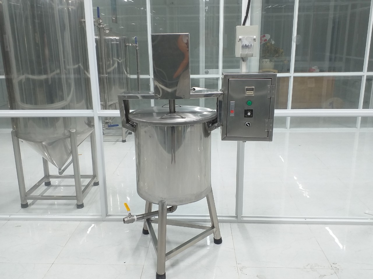 6. Máy khuấy trộn dung dịch để sản xuất tinh dầu chiết chai hoặc sản xuất mỹ phẩm dung tích 100 lit cánh khuấy 1HP, biến tầng điều chỉnh tốc độ khuấy theo yêu cầu:
