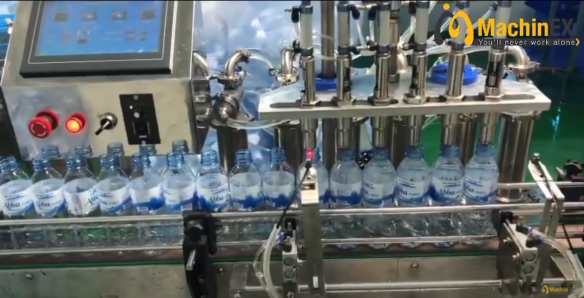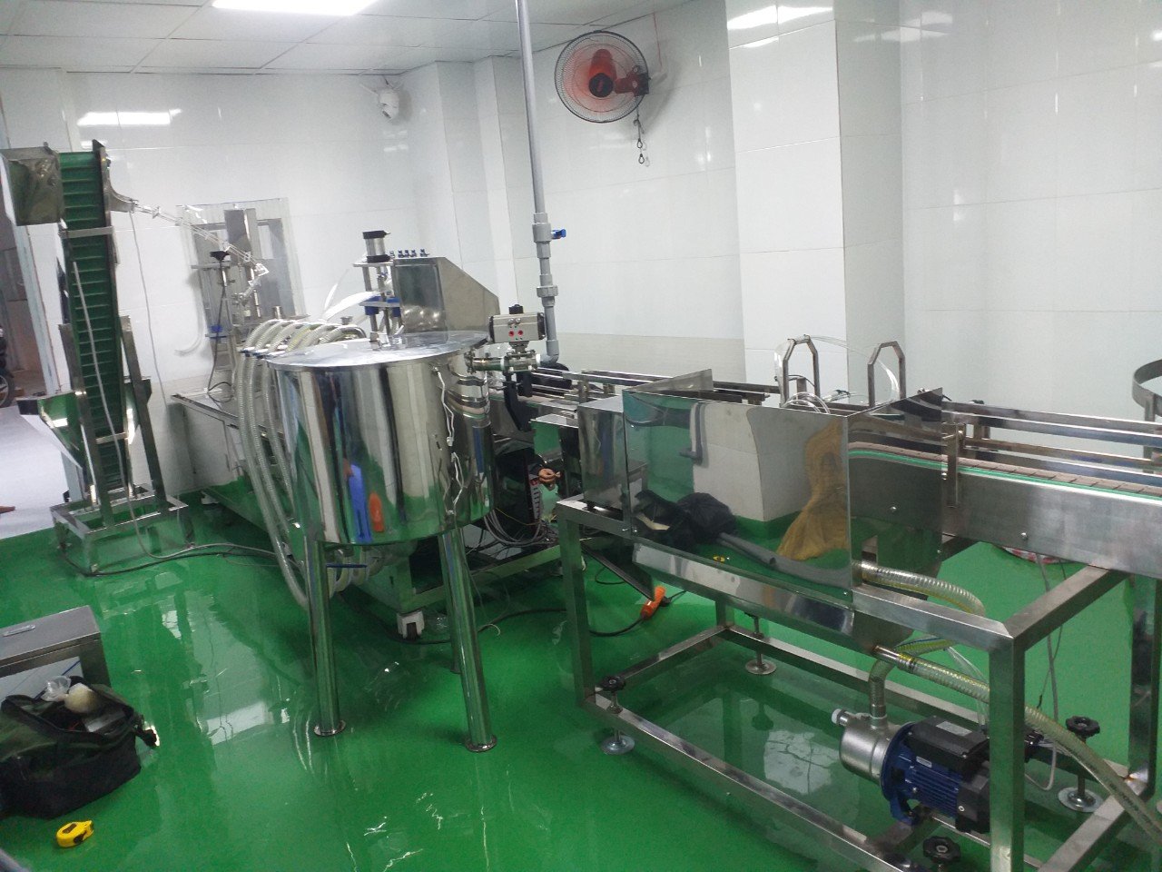 Sau đó công nhân cho 2 bình vào vòi chiết ấn nút xanh khởi động thì bơm chiết hoạt động theo định lượng thời gian chạy hết time cái đặt thì 2 bình đã được chiết xong và công nhân tiền hành lấy bình ra và thao tác vặn nắp co màng bằng tay là thành phẩm. công suất máy tùy thuộc vào khả năng thao tác vận hành nhanh chậm của công nhân.