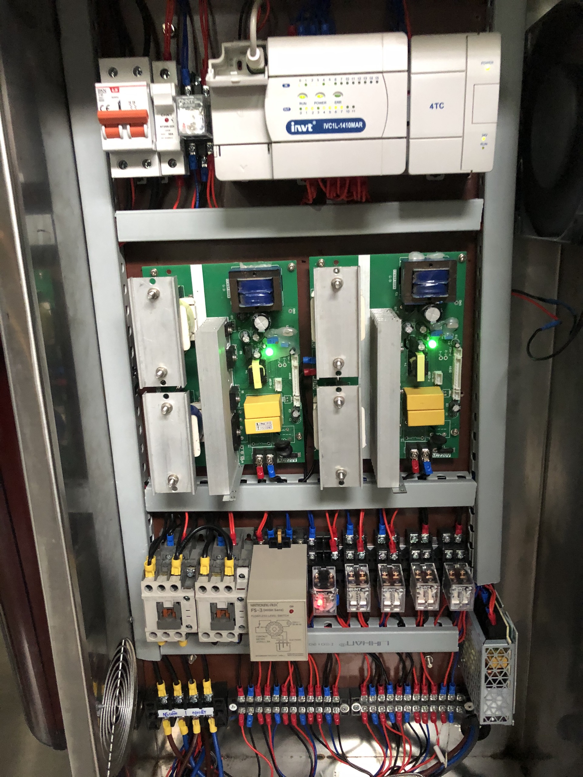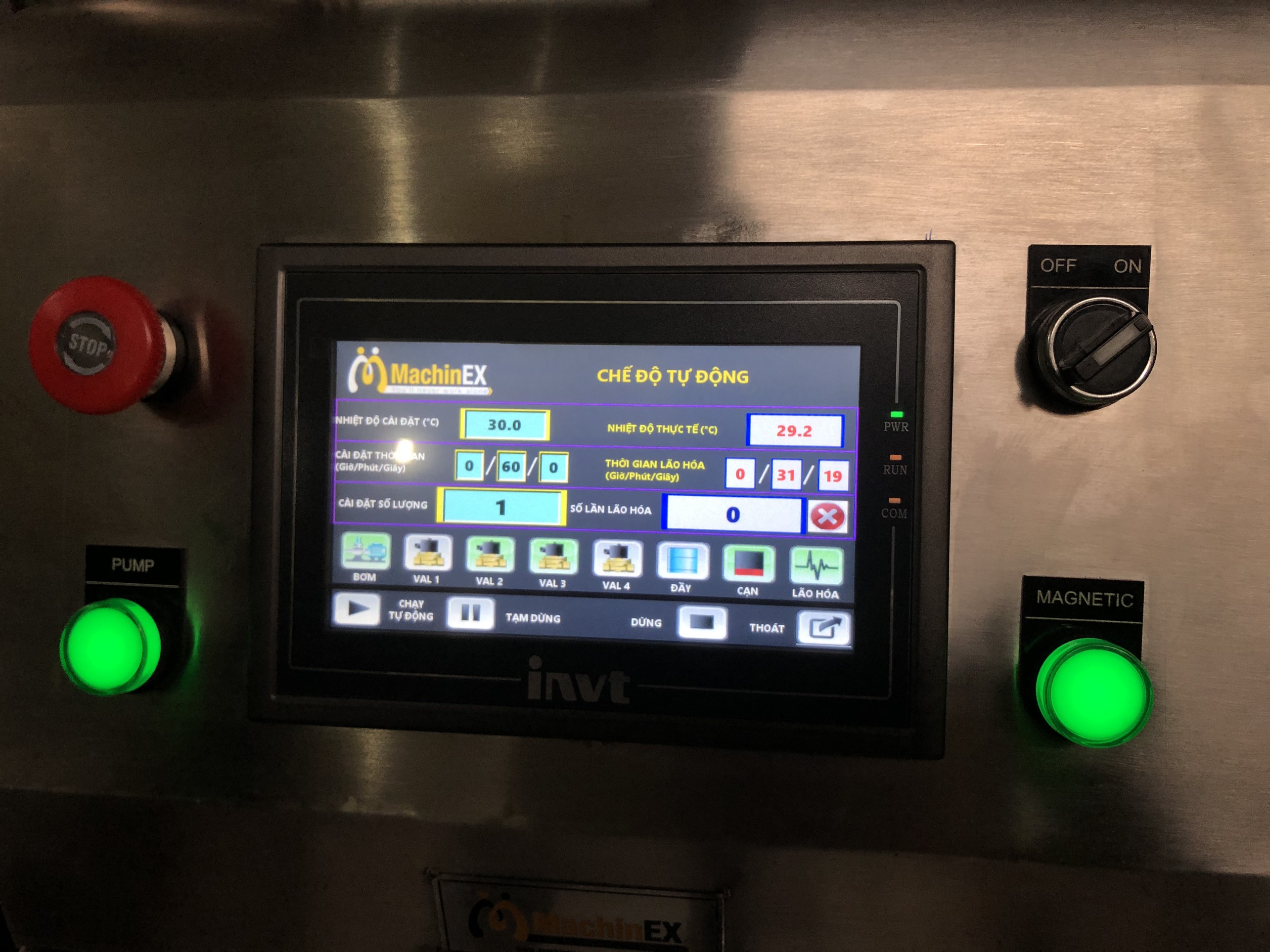 Phần cuối cùng là phần quan trọng nhất được coi là trái tim của máy là hệ thống tủ điện điều khiển tự động được tích hợp điều khiển lập trình PLC và màn hình cảm ứng delta hiển thị cài đặt thông số chi tiết, như số mẻ cần lão hóa, thời gian lão hóa mổi mẻ, nhiệt độ dung dịch và chế độ vận hành sử dụng thủ công hay tự động.