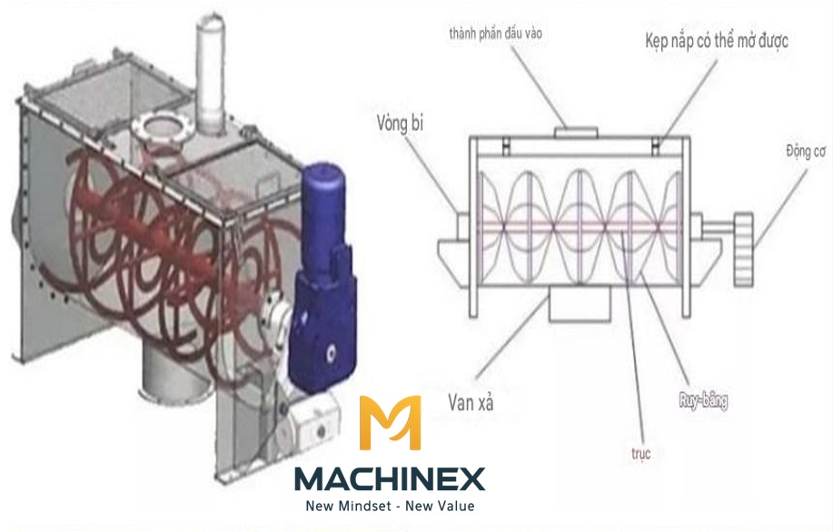 Máy trộn nằm ngang Machinex được chế tạo từ vật liệu cao cấp, độ hoàn thiện tinh xảo, đảm bảo hoạt động bền bỉ trong môi trường công nghiệp. Dưới đây là cấu tạo cơ bản: