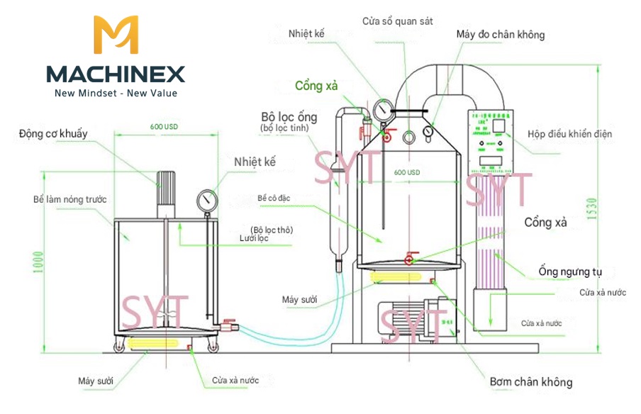 Thiết bị hoạt động dựa trên nguyên lý cô đặc trong môi trường chân không kết hợp khuấy trộn và gia nhiệt nhẹ: