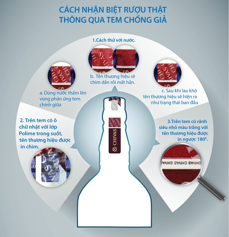 Đối với những hãng rượu nổi tiếng như Balanttine’s, Chivas, Royal.. thường có tem thông minh dán trên mỗi chai để phân biệt hàng giả hàng thật.